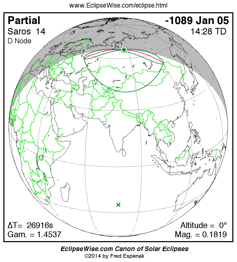 The instant of greatest eclipse takes place on -1089 Jan 05 at 14:27:33 TD (06:59:01 UT1).