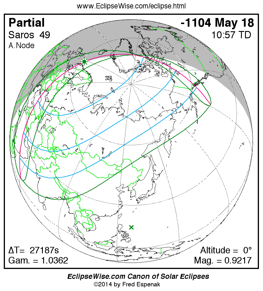 The instant of greatest eclipse takes place on -1104 May 18 at 10:57:30 TD (03:24:26 UT1).
