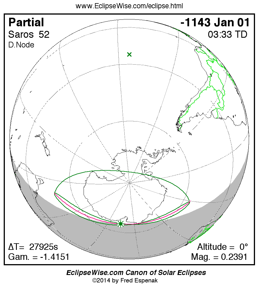 The instant of greatest eclipse takes place on -1143 Jan 02 at 03:33:01 TD (19:47:39 UT1).