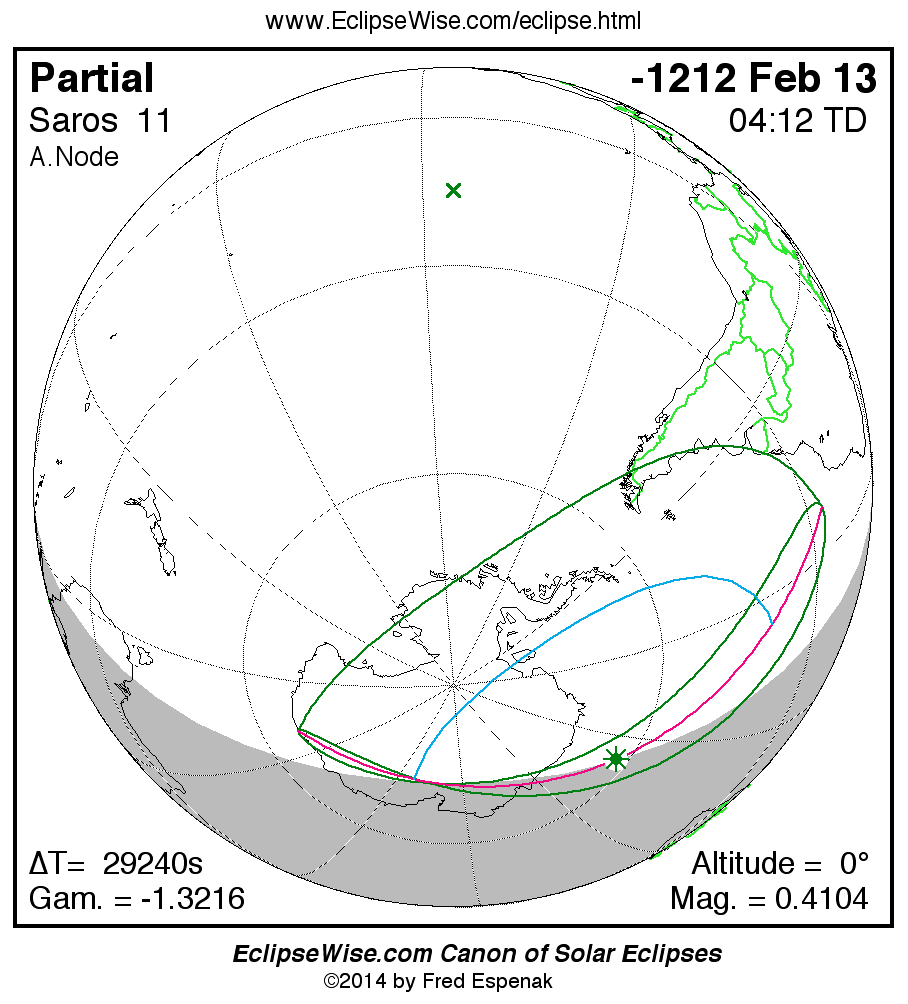 The instant of greatest eclipse takes place on -1212 Feb 14 at 04:12:22 TD (20:05:05 UT1).