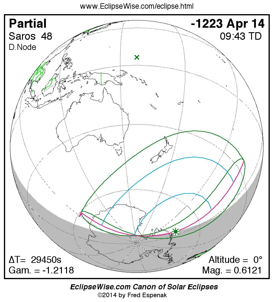 The instant of greatest eclipse takes place on -1223 Apr 14 at 09:42:40 TD (01:31:54 UT1).
