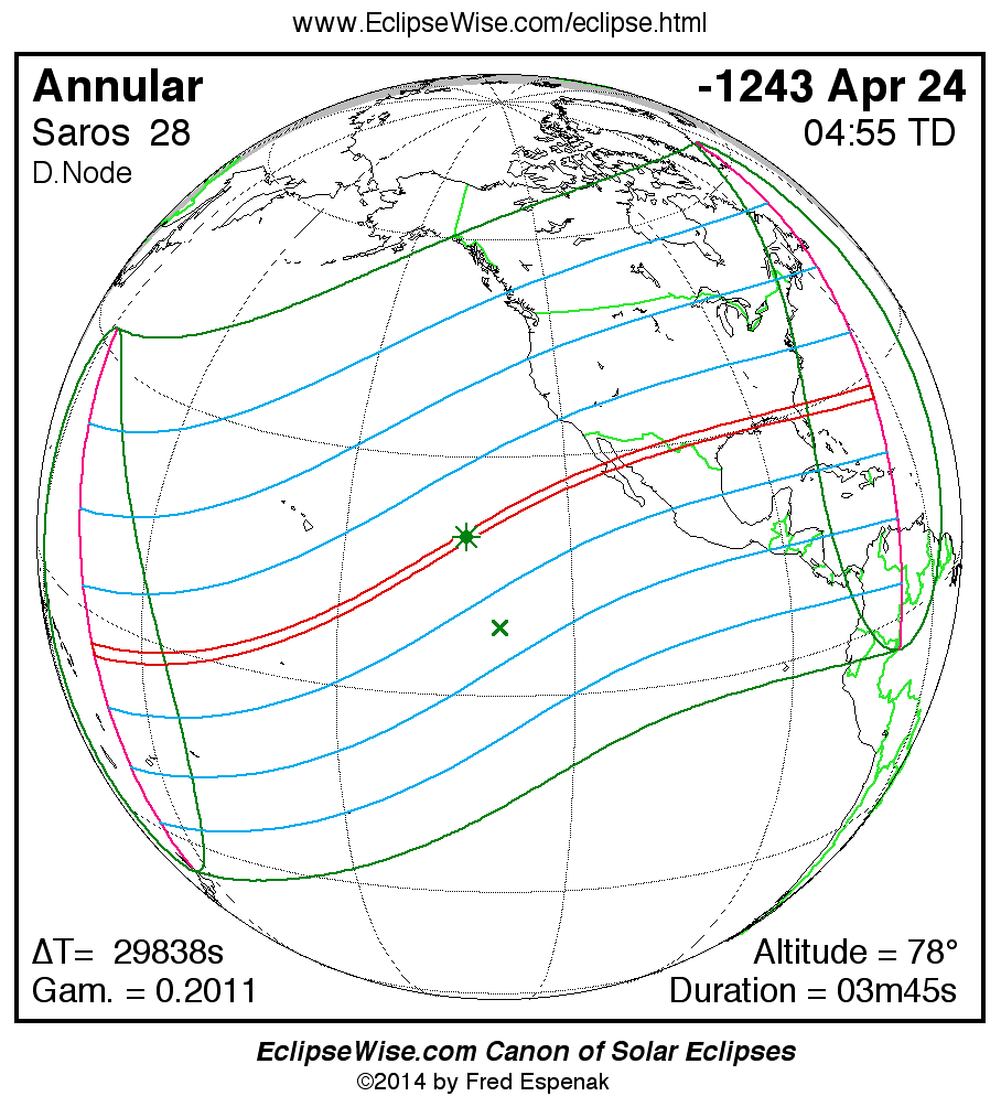 - Path Table: Annular Solar Eclipse of -1243 Apr 25 - coordinates of the central line and path limits