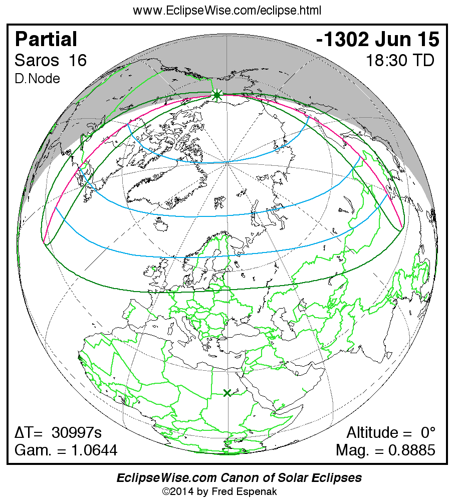The instant of greatest eclipse takes place on -1302 Jun 15 at 18:30:08 TD (09:53:35 UT1).