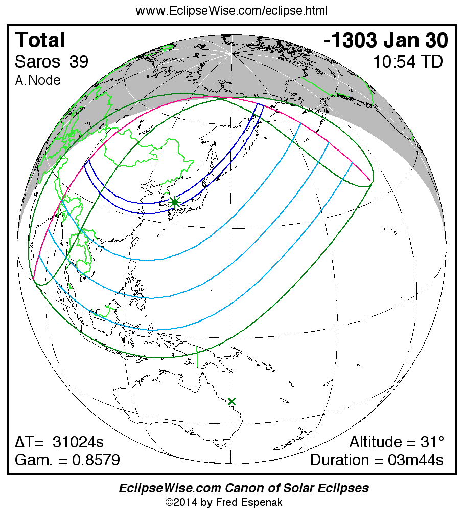 Total Solar Eclipse of -1303 Jan 30 (1304 Jan 30 BCE)