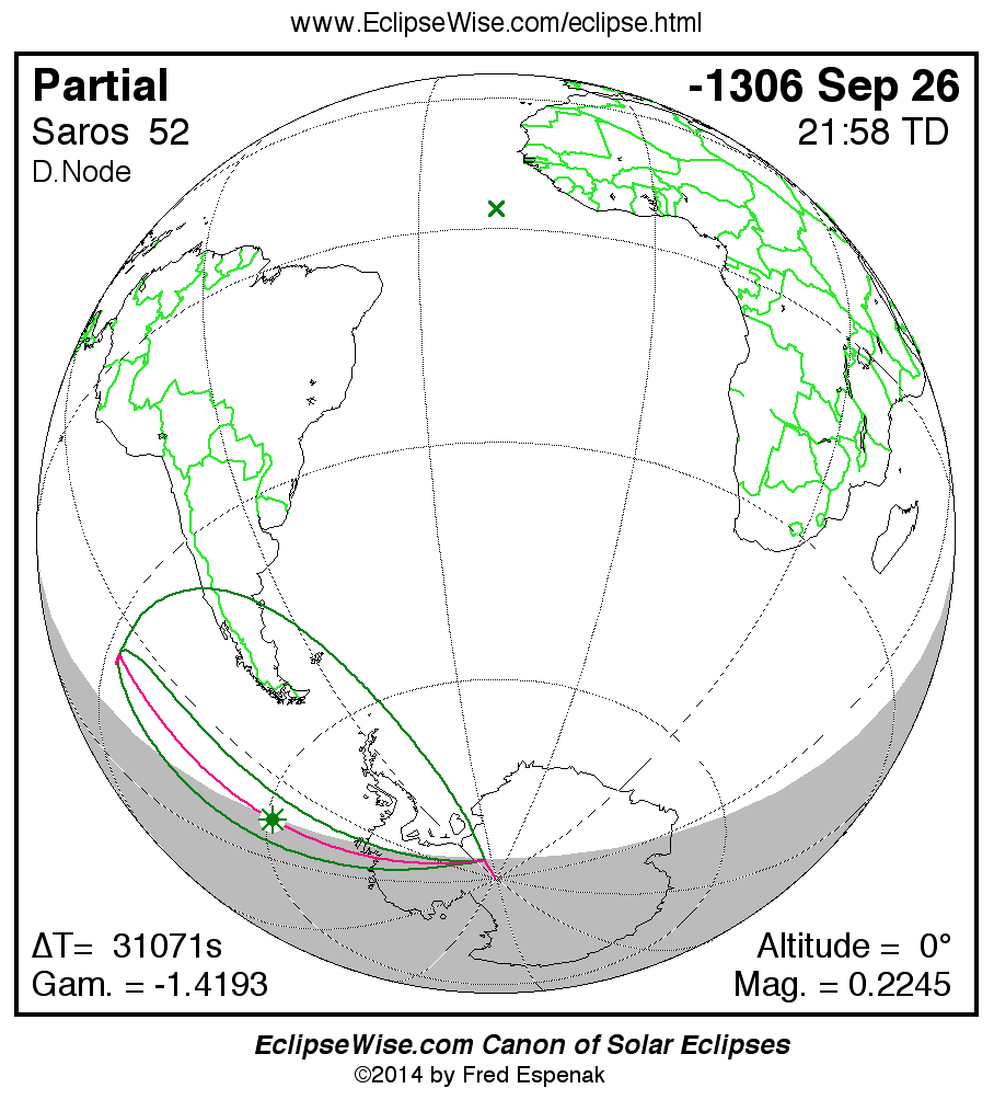 The instant of greatest eclipse takes place on -1306 Sep 26 at 21:58:14 TD (13:20:27 UT1).