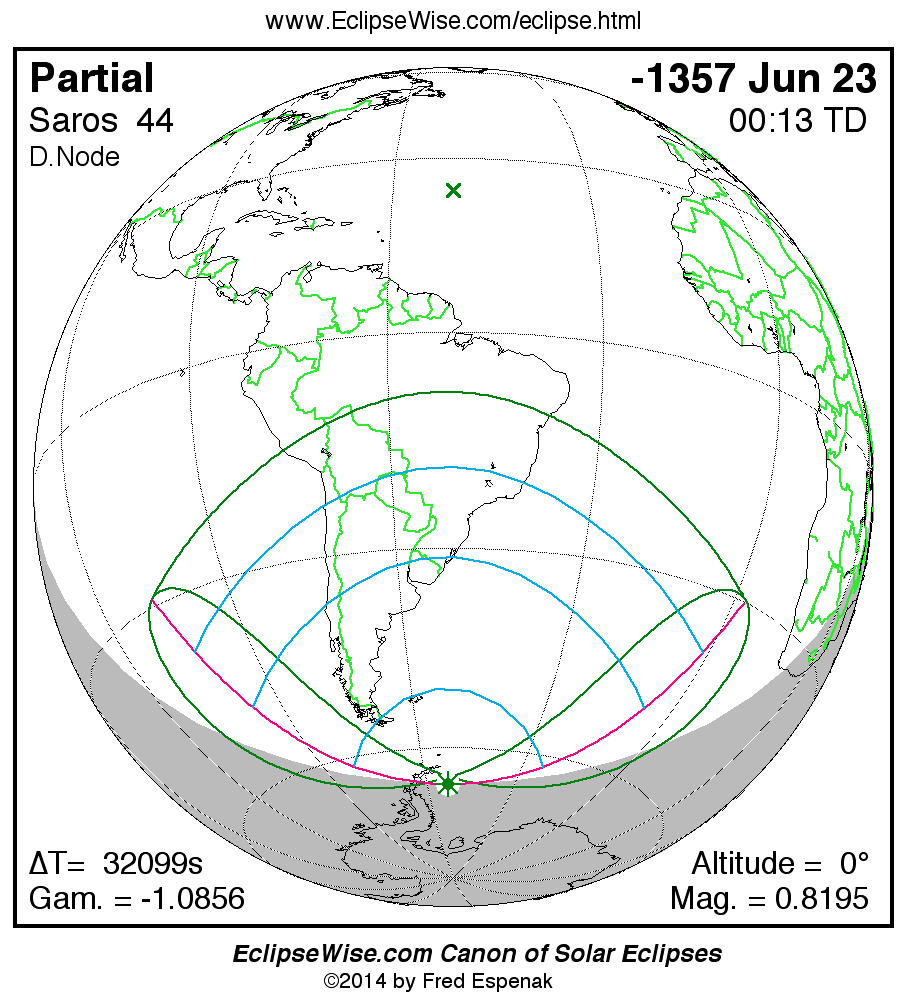 The instant of greatest eclipse takes place on -1357 Jun 24 at 00:13:27 TD (15:18:32 UT1).