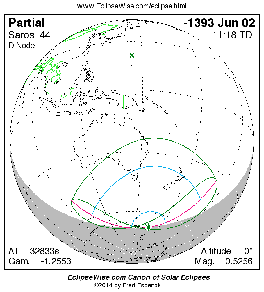 The instant of greatest eclipse takes place on -1393 Jun 02 at 11:17:33 TD (02:10:24 UT1).
