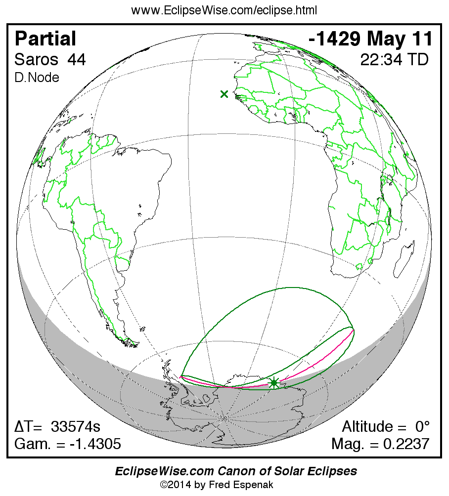 The instant of greatest eclipse takes place on -1429 May 11 at 22:34:06 TD (13:14:35 UT1).
