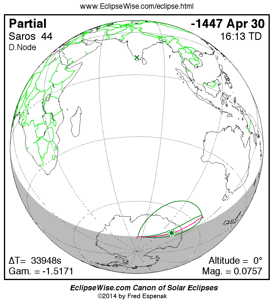 The eclipse belongs to Saros 44 and is number 1 of 72 eclipses in the series. Thus, the -1447 Apr 30 event is the very first eclipse of the series . All eclipses in this series occur at the Moons descending node. The Moon moves northward with respect to the node with each succeeding eclipse in the series and gamma increases.