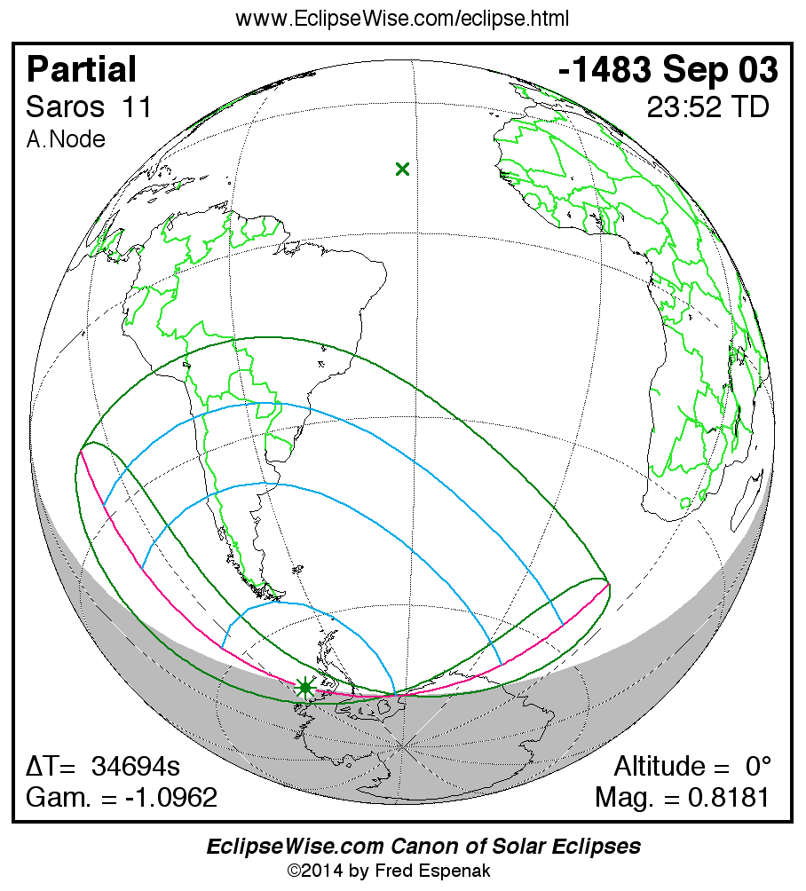 The instant of greatest eclipse takes place on -1483 Sep 03 at 23:52:00 TD (14:13:51 UT1).