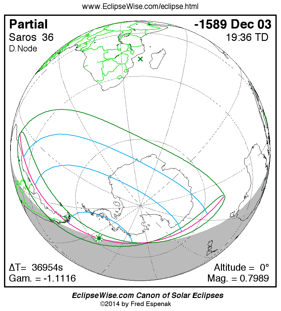 The instant of greatest eclipse takes place on -1589 Dec 03 at 19:36:01 TD (09:20:12 UT1).