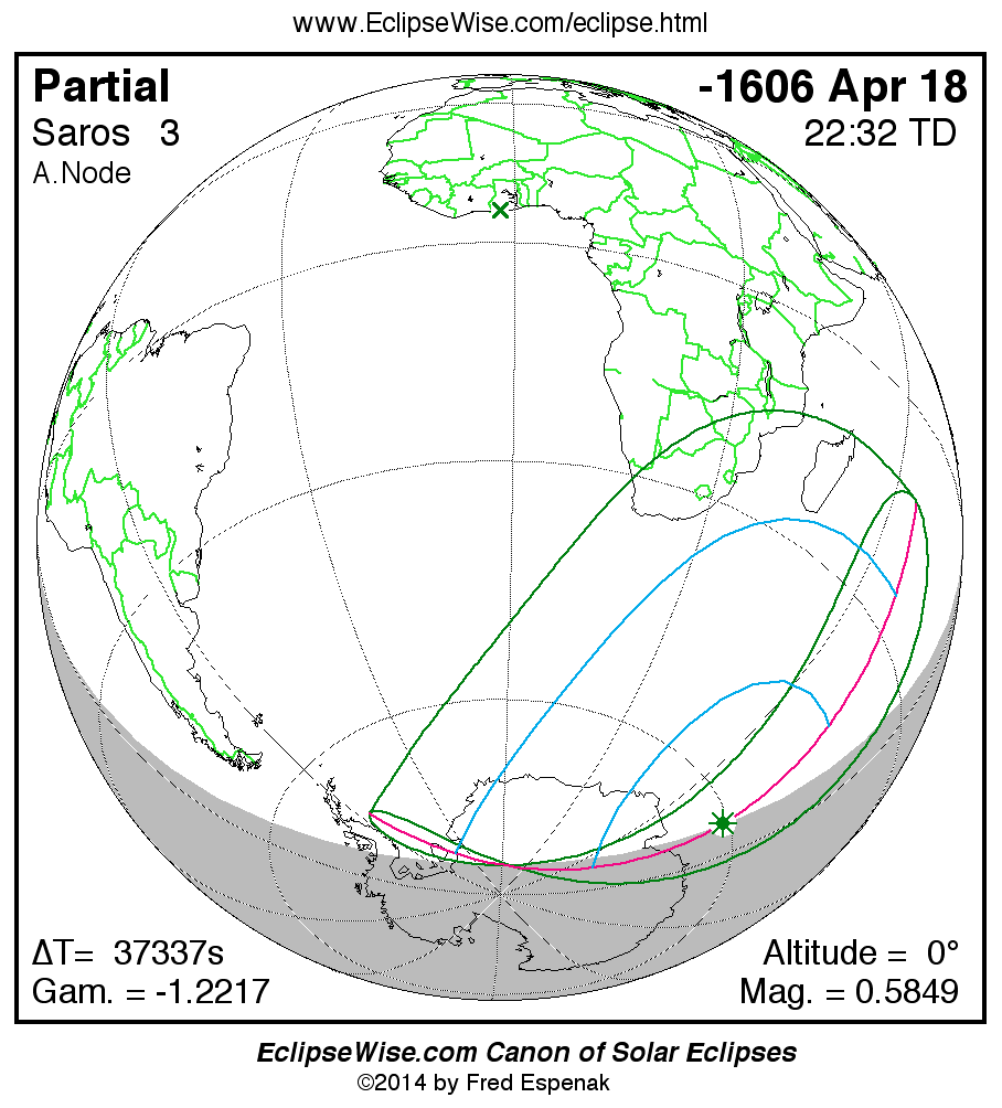 The instant of greatest eclipse takes place on -1606 Apr 18 at 22:32:09 TD (12:09:56 UT1).