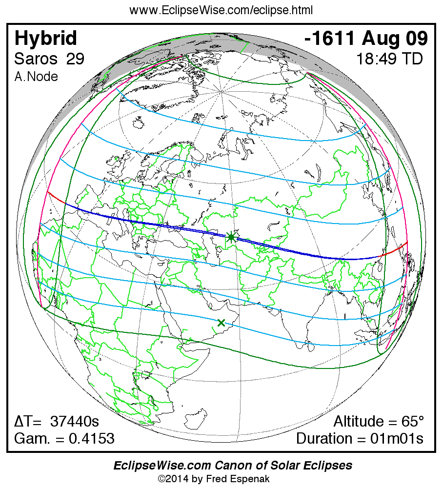 - Google Map: Hybrid Solar Eclipse of -1611 Aug 09 - interactive map of the eclipse path