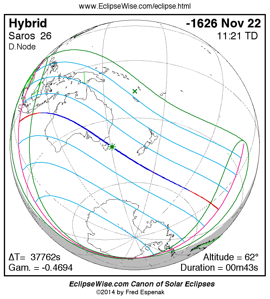 - Orthographic Map: Hybrid Solar Eclipse of -1626 Nov 22 - global map of eclipse visibility