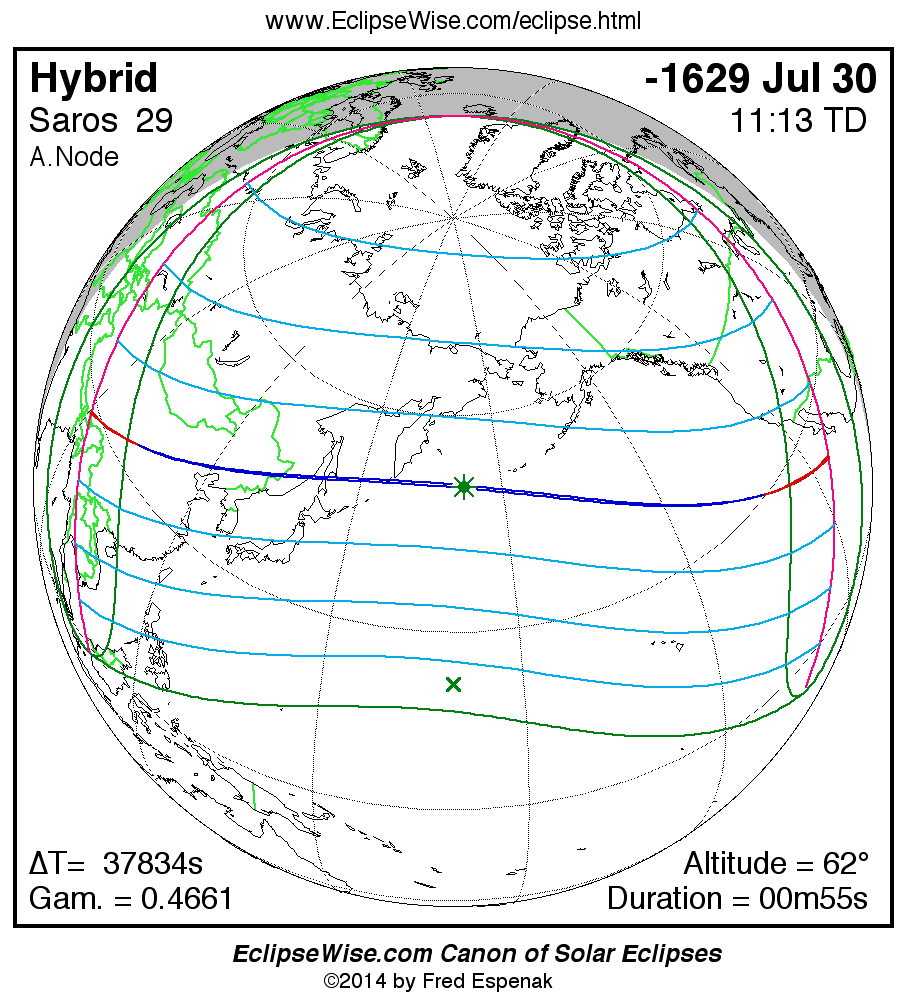 - Orthographic Map: Hybrid Solar Eclipse of -1629 Jul 30 - global map of eclipse visibility