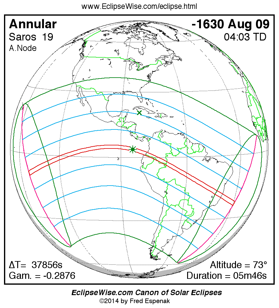 - Orthographic Map: Annular Solar Eclipse of -1630 Aug 10 - global map of eclipse visibility
