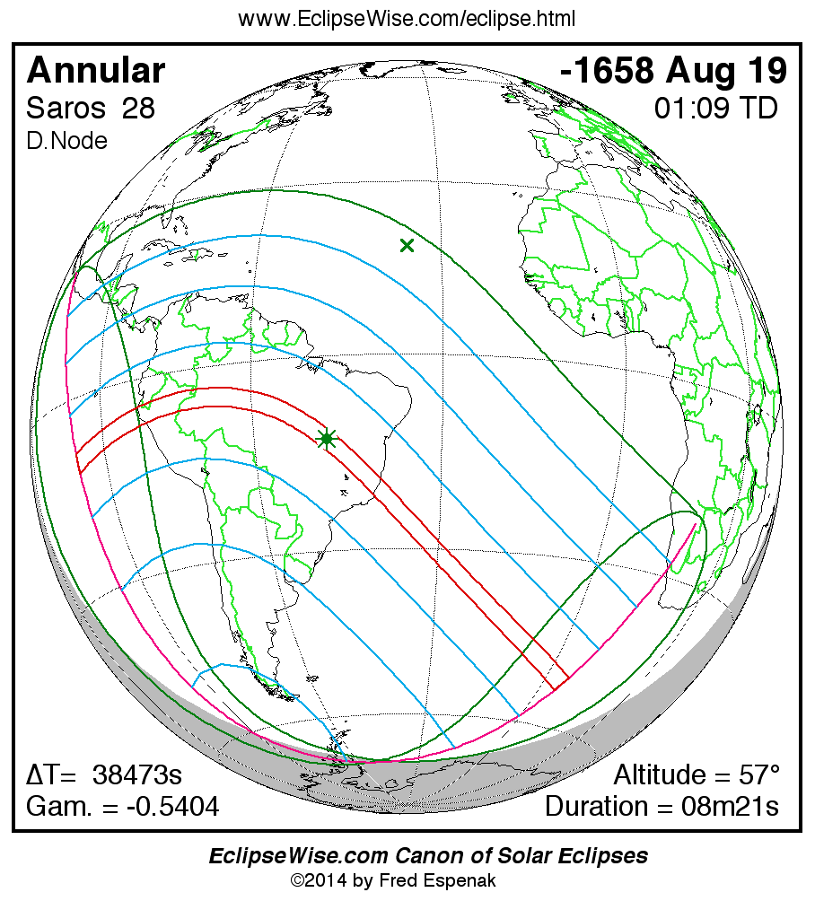 - Orthographic Map: Annular Solar Eclipse of -1658 Aug 20 - global map of eclipse visibility