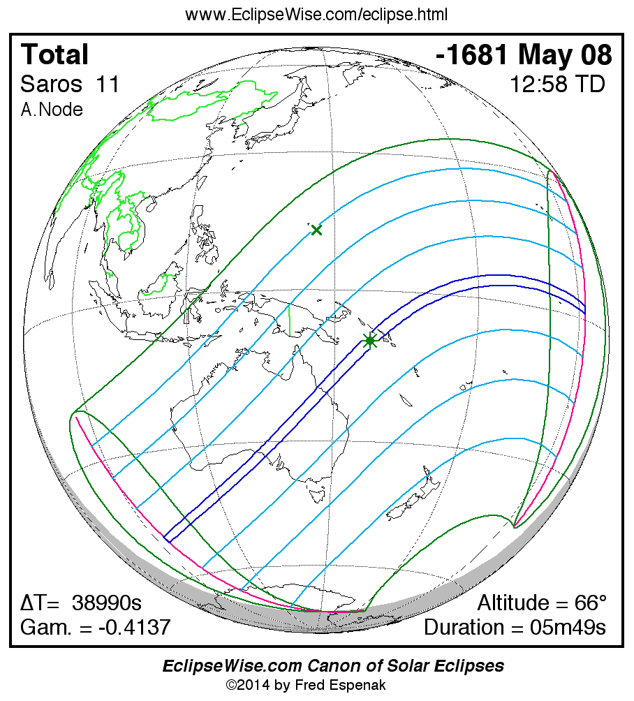 - Path Table: Total Solar Eclipse of -1681 May 08 - coordinates of the central line and path limits