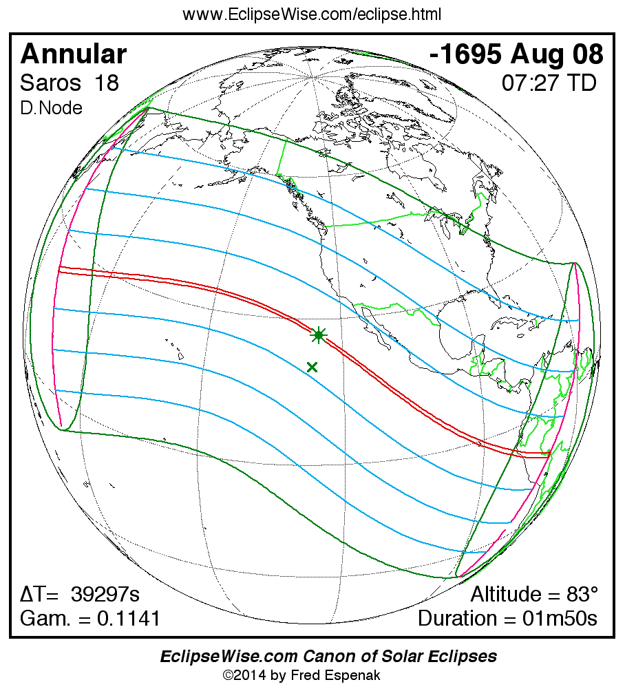 - Path Table: Annular Solar Eclipse of -1695 Aug 09 - coordinates of the central line and path limits