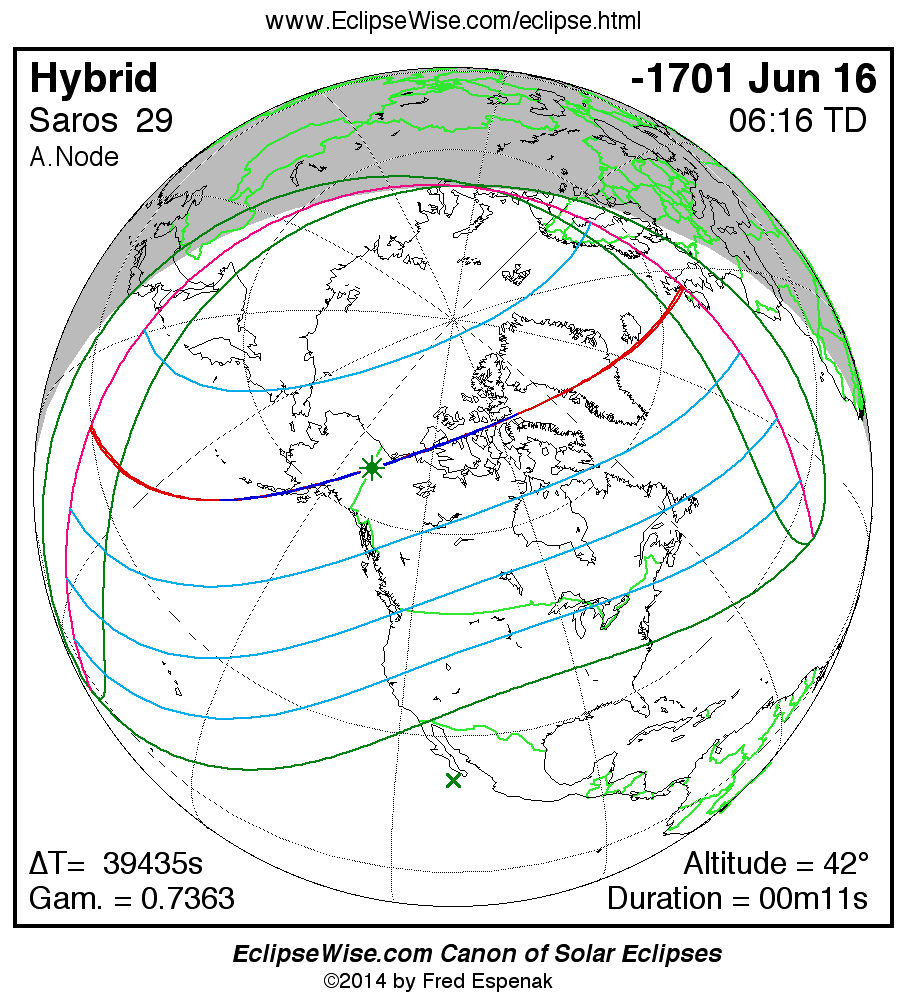 The solar eclipse of -1701 Jun 17 is one of the rare hybrid solar eclipses. In this particular case the eclipse path starts out as annular. Further down the track it changes to total and then back to annular before the path ends. It is a very short hybrid eclipse with a duration at greatest eclipse of 00m11s. The eclipse magnitude is 1.0025, while Gamma has a value of 0.7363.