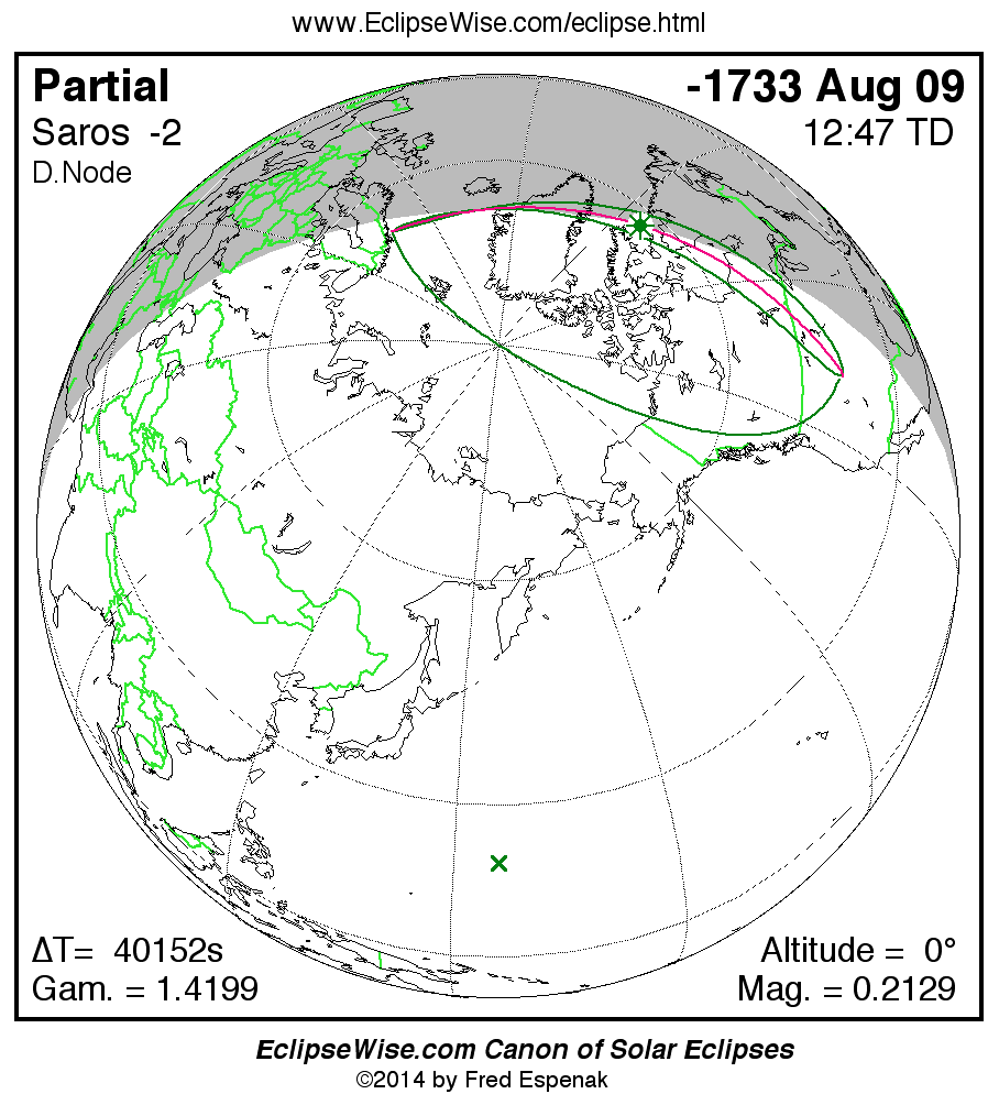The instant of greatest eclipse takes place on -1733 Aug 09 at 12:47:26 TD (01:38:19 UT1).