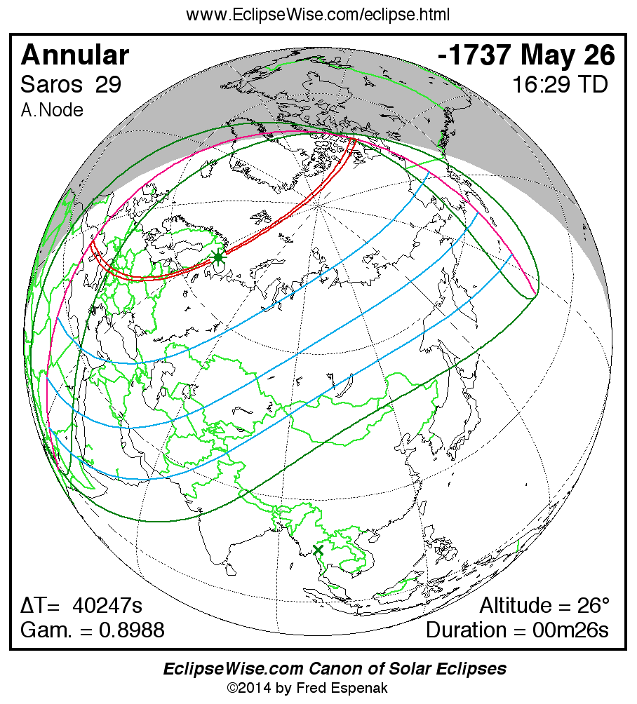- Path Table: Annular Solar Eclipse of -1737 May 26 - coordinates of the central line and path limits