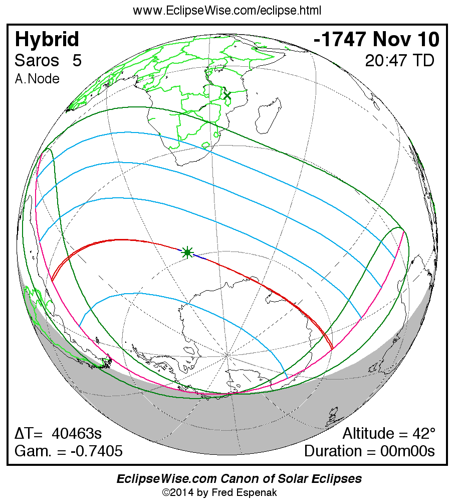 - Orthographic Map: Hybrid Solar Eclipse of -1747 Nov 10 - global map of eclipse visibility