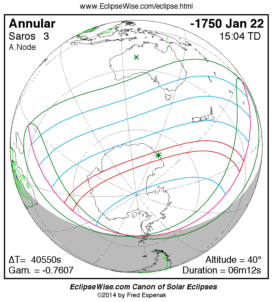 - Path Table: Annular Solar Eclipse of -1750 Jan 22 - coordinates of the central line and path limits
