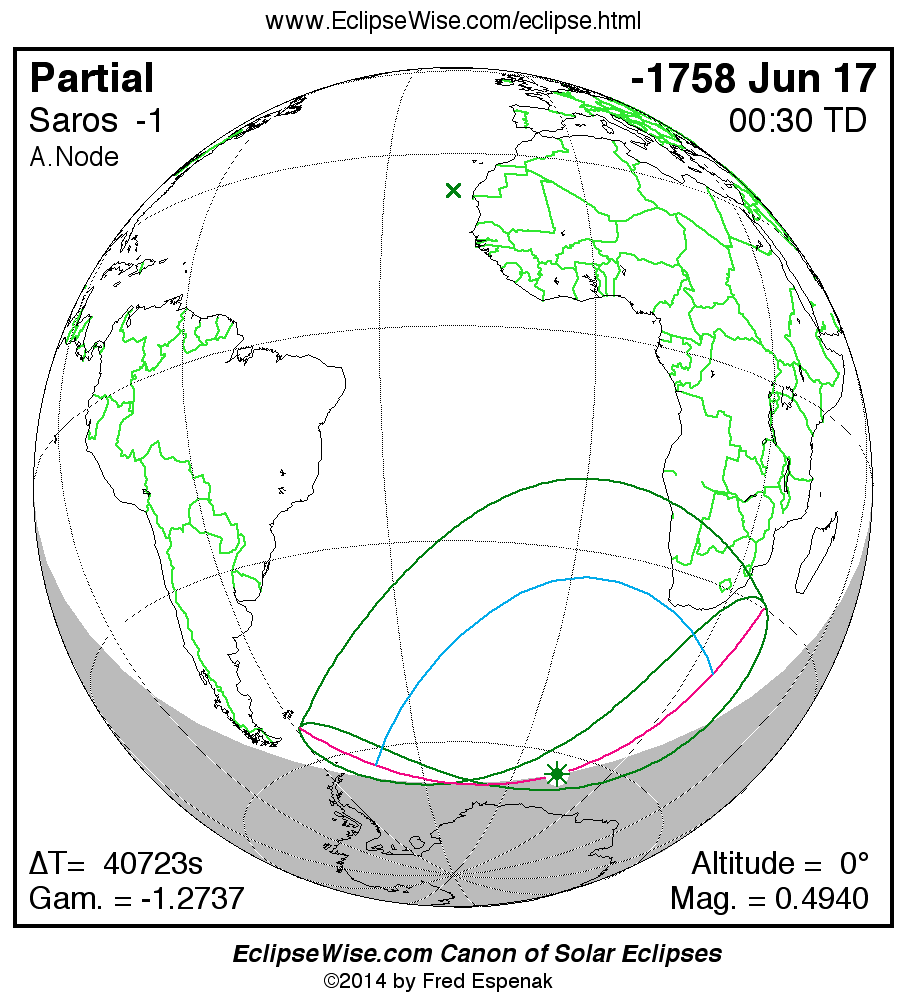 The instant of greatest eclipse takes place on -1758 Jun 18 at 00:30:09 TD (13:11:31 UT1).