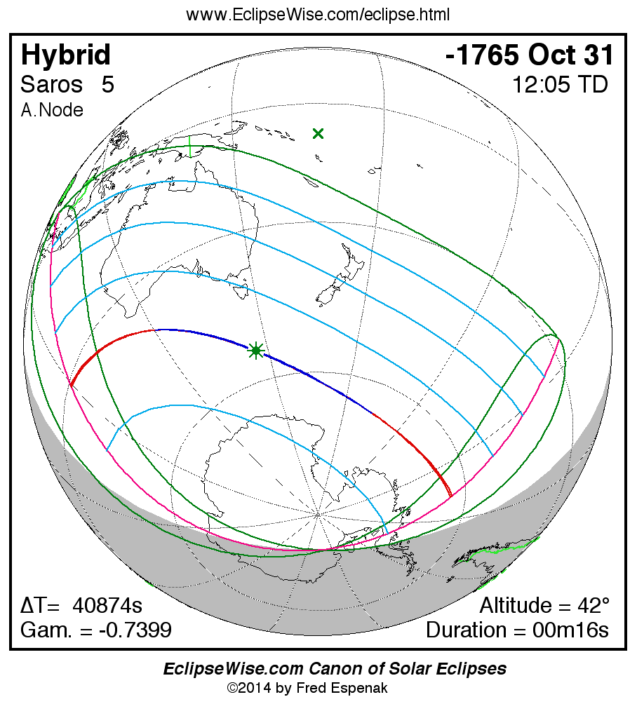 The solar eclipse of -1765 Oct 31 is one of the rare hybrid solar eclipses. In this particular case the eclipse path starts out as annular. Further down the track it changes to total and then back to annular before the path ends. It is a very short hybrid eclipse with a duration at greatest eclipse of 00m16s. The eclipse magnitude is 1.0034, while Gamma has a value of -0.7399.