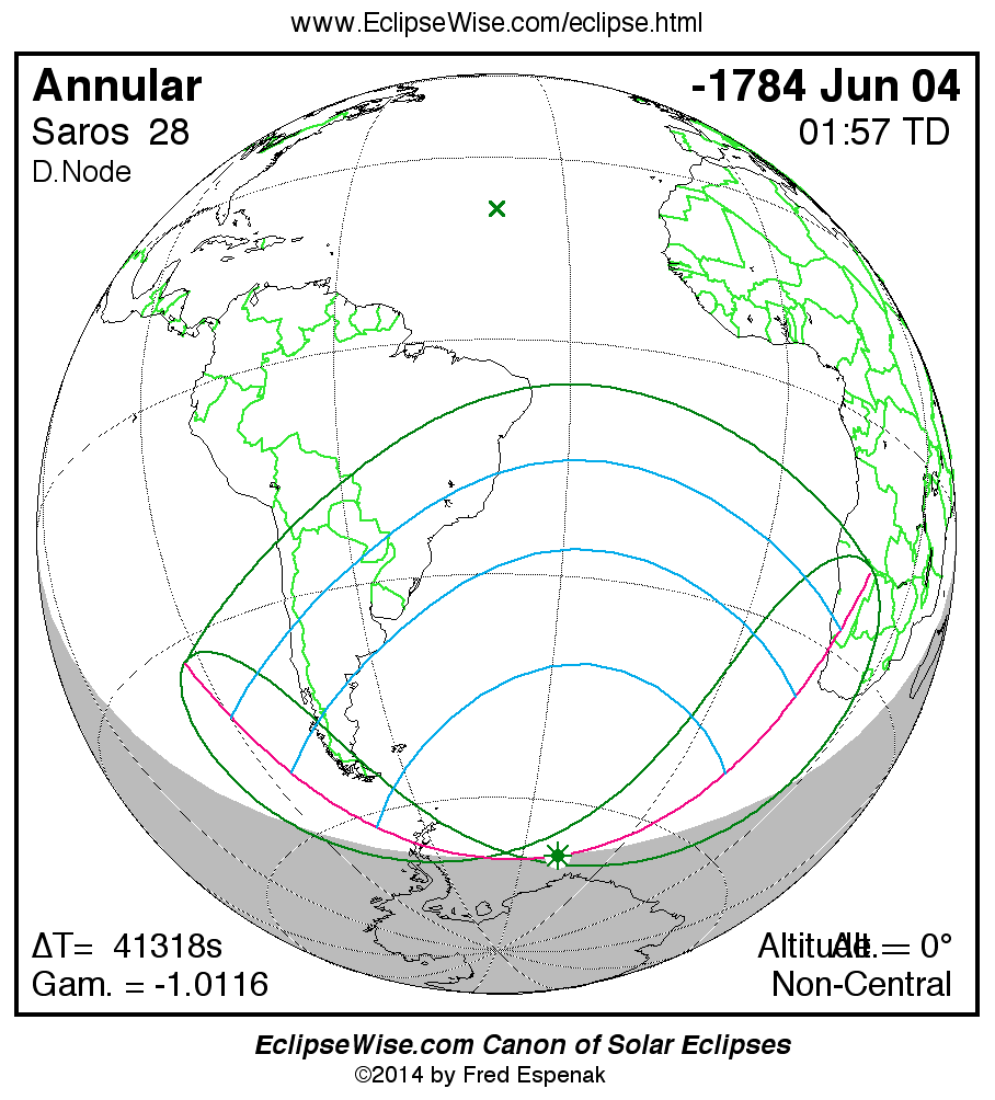 The instant of greatest eclipse takes place on -1784 Jun 05 at 01:57:00 TD (14:28:28 UT1).