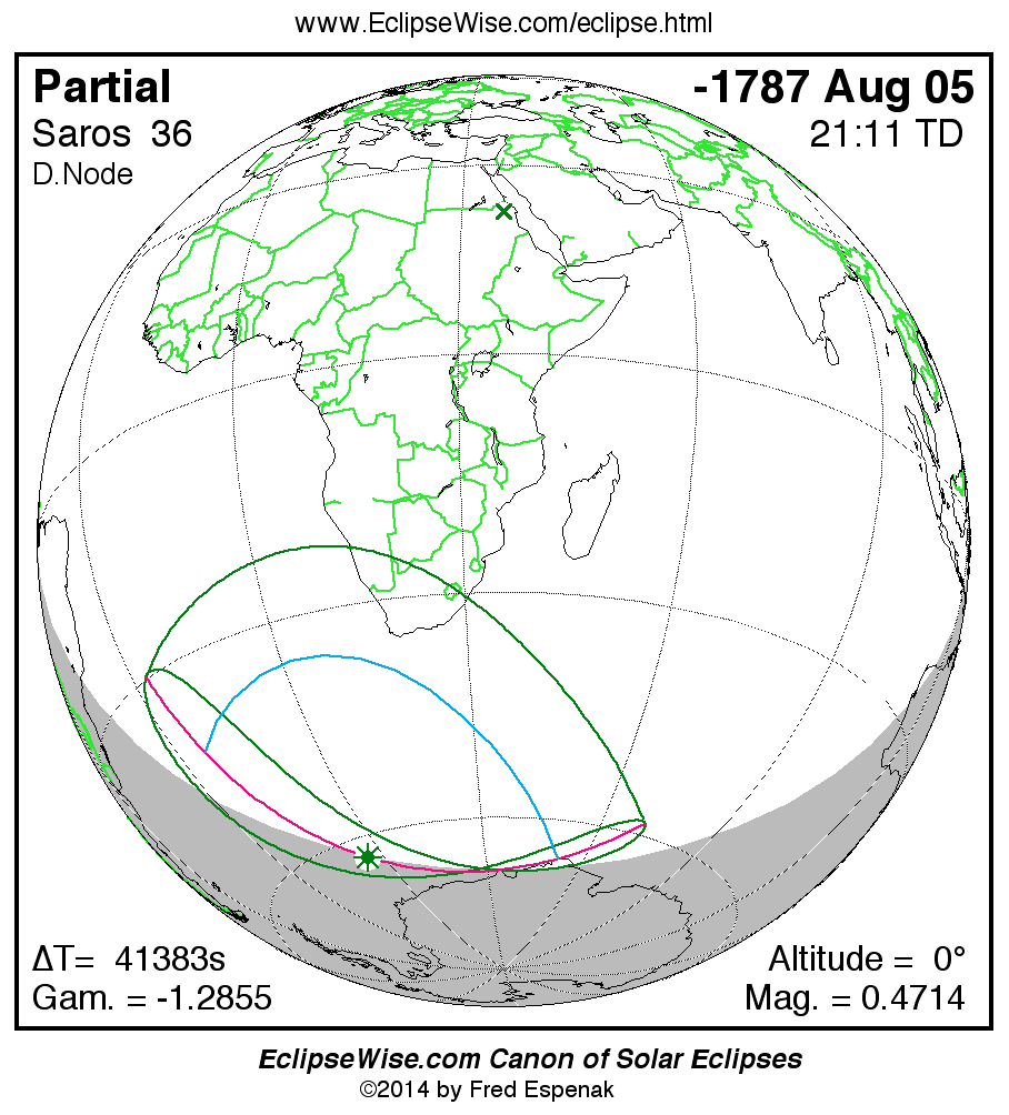 The instant of greatest eclipse takes place on -1787 Aug 05 at 21:10:34 TD (09:40:56 UT1).