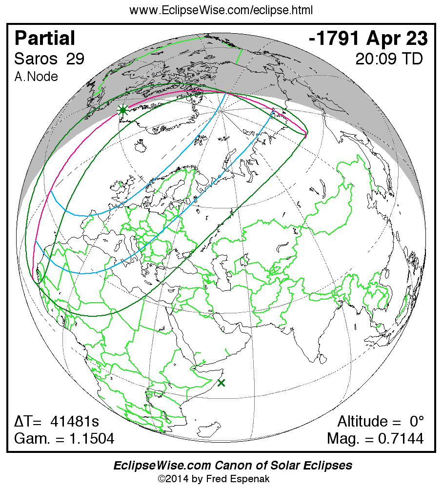 The instant of greatest eclipse takes place on -1791 Apr 23 at 20:08:49 TD (08:37:33 UT1).