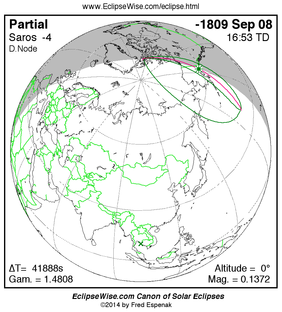 The instant of greatest eclipse takes place on -1809 Sep 08 at 16:52:51 TD (05:14:48 UT1).