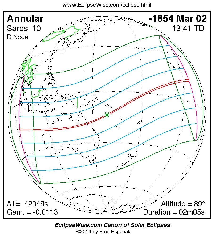 - Path Table: Annular Solar Eclipse of -1854 Mar 02 - coordinates of the central line and path limits