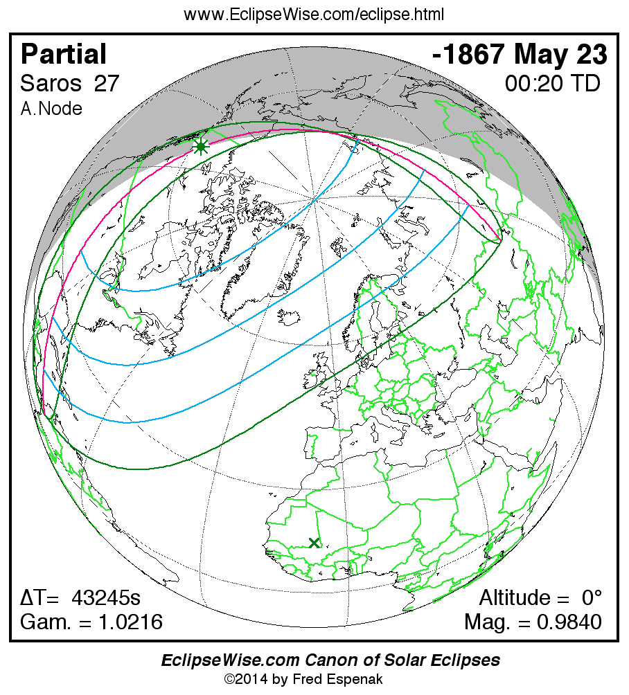The instant of greatest eclipse takes place on -1867 May 24 at 00:20:04 TD (12:19:24 UT1).