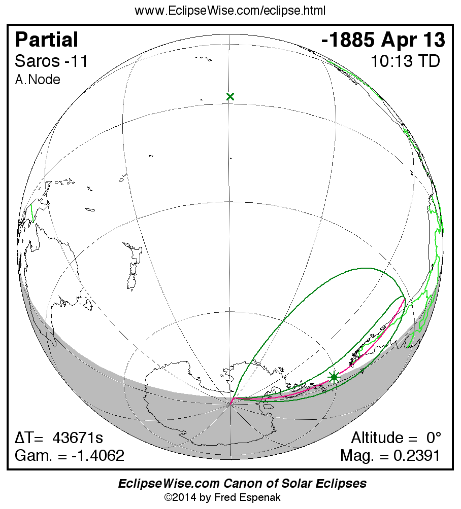 The instant of greatest eclipse takes place on -1885 Apr 14 at 10:13:17 TD (22:05:31 UT1).