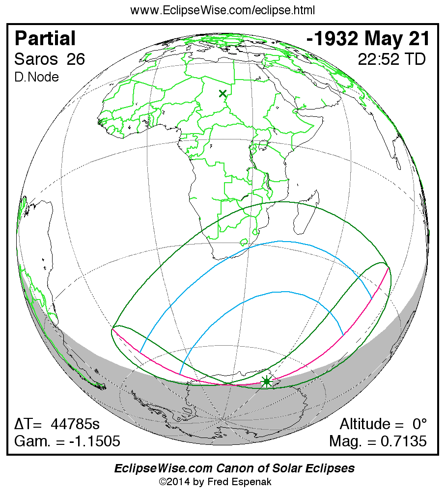 The instant of greatest eclipse takes place on -1932 May 21 at 22:52:06 TD (10:25:47 UT1).