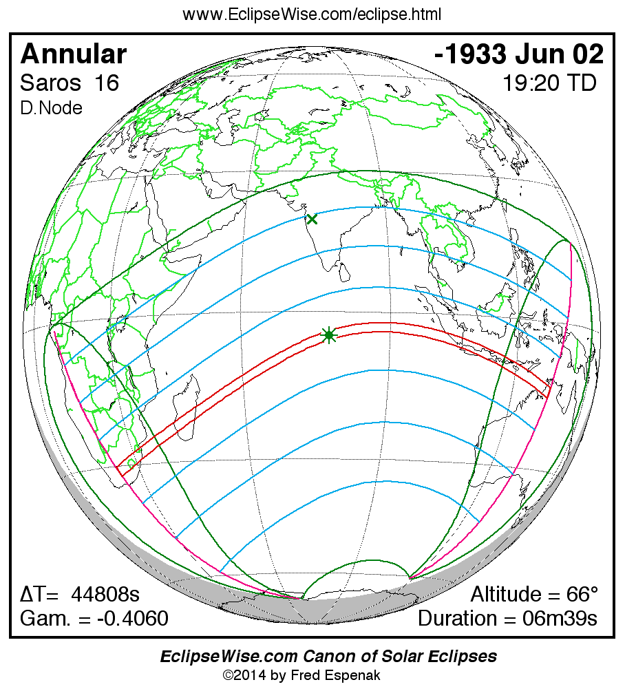 - Path Table: Annular Solar Eclipse of -1933 Jun 02 - coordinates of the central line and path limits