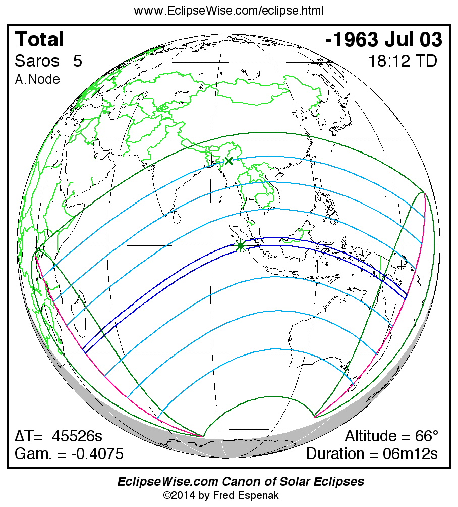 The solar eclipse of -1963 Jul 03 is an exceptionally long total eclipse with a duration at greatest eclipse of 06m12s. It has an eclipse magnitude of 1.0646.