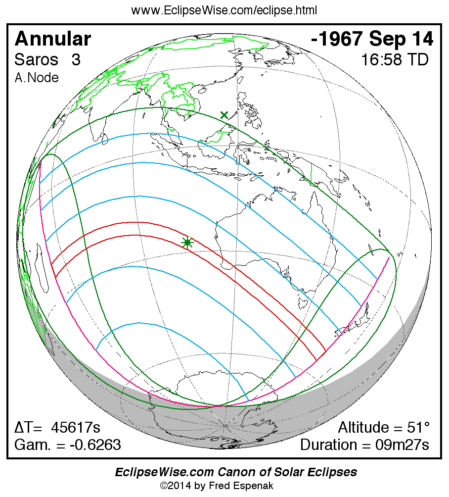 - Path Table: Annular Solar Eclipse of -1967 Sep 14 - coordinates of the central line and path limits