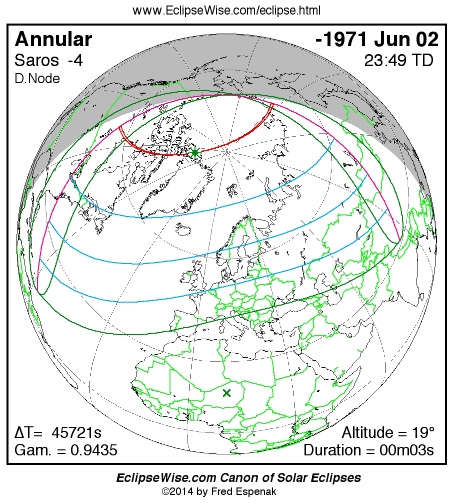 - Path Table: Annular Solar Eclipse of -1971 Jun 02 - coordinates of the central line and path limits