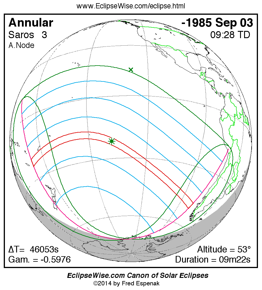 - Orthographic Map: Annular Solar Eclipse of -1985 Sep 04 - global map of eclipse visibility