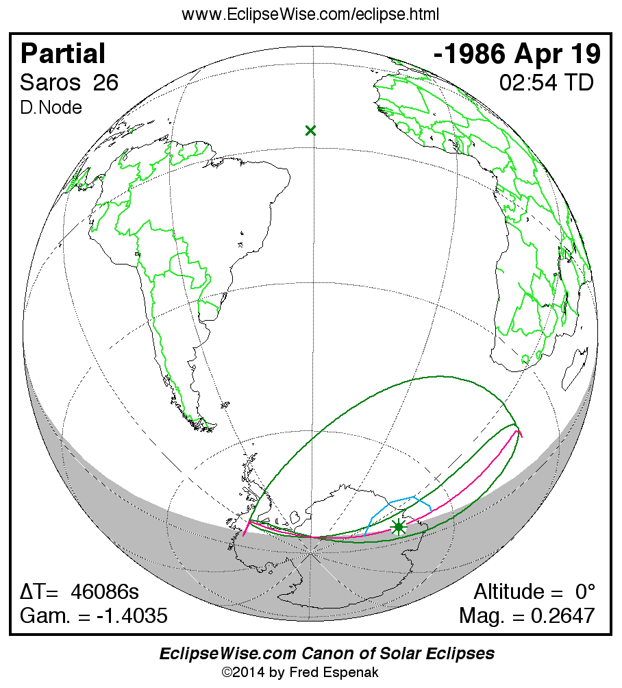 The instant of greatest eclipse takes place on -1986 Apr 20 at 02:54:00 TD (14:05:60 UT1).