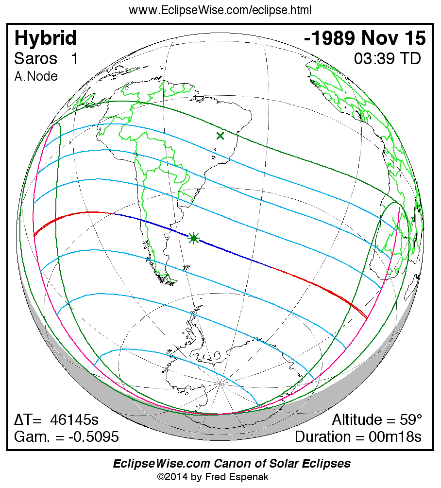 The solar eclipse of -1989 Nov 16 is one of the rare hybrid solar eclipses. In this particular case the eclipse path starts out as annular. Further down the track it changes to total and then back to annular before the path ends. It is a very short hybrid eclipse with a duration at greatest eclipse of 00m18s. The eclipse magnitude is 1.0036, while Gamma has a value of -0.5095.