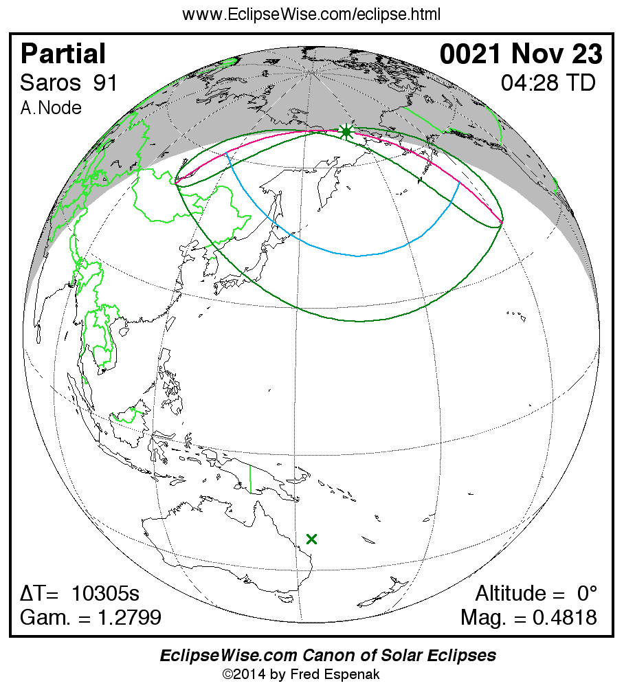 Another solar eclipse occurs one synodic month before the 0021 Nov 23 eclipse. It is the partial solar eclipse of 0021 Oct 24.