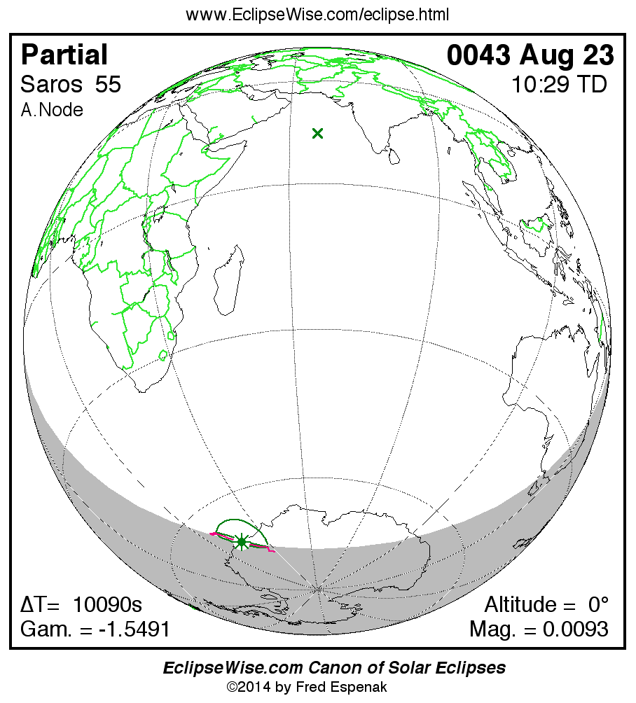 The eclipse belongs to Saros 55 and is number 73 of 73 eclipses in the series. Thus, the 0043 Aug 23 event is the last eclipse of the series . All eclipses in this series occur at the Moons ascending node. The Moon moves southward with respect to the node with each succeeding eclipse in the series and gamma decreases.
