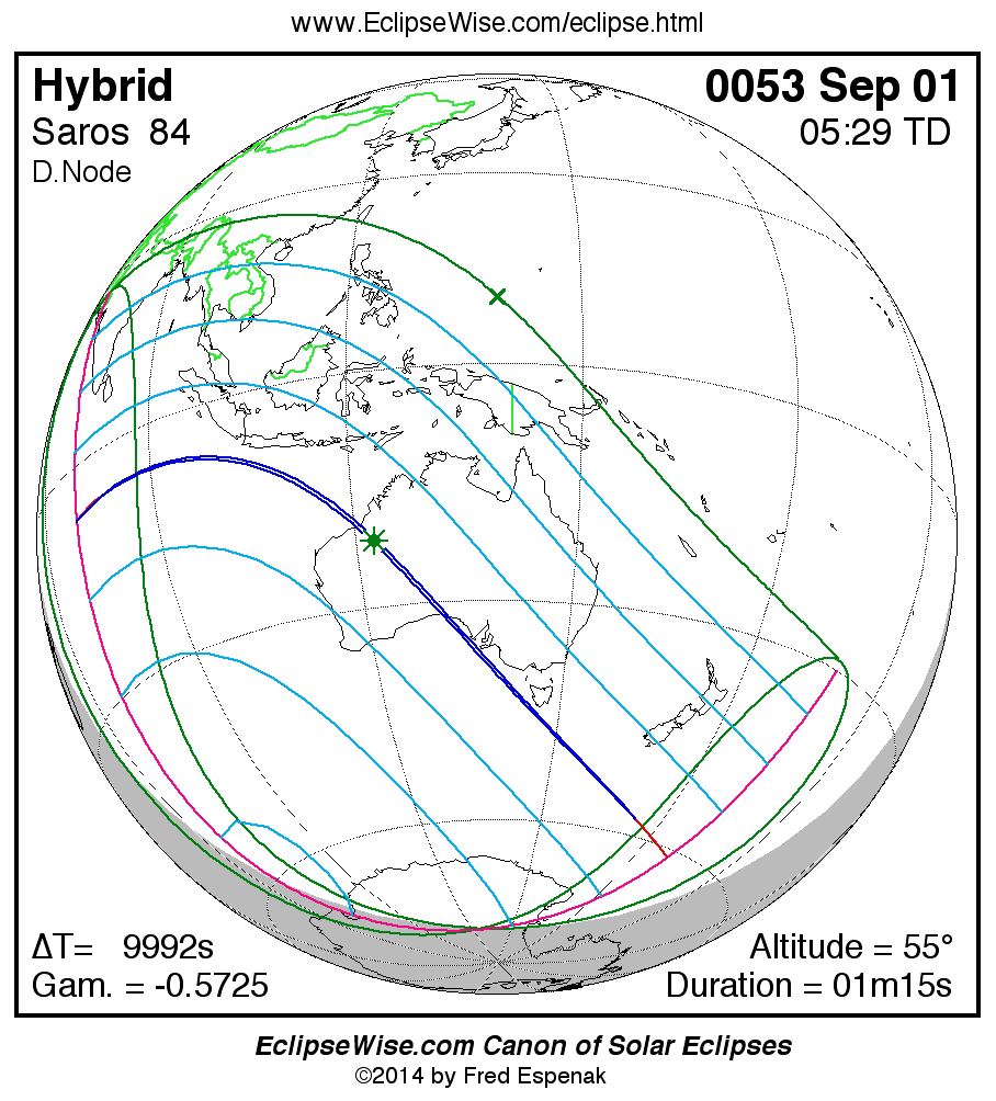- Orthographic Map: Hybrid Solar Eclipse of 0053 Sep 01 - global map of eclipse visibility
