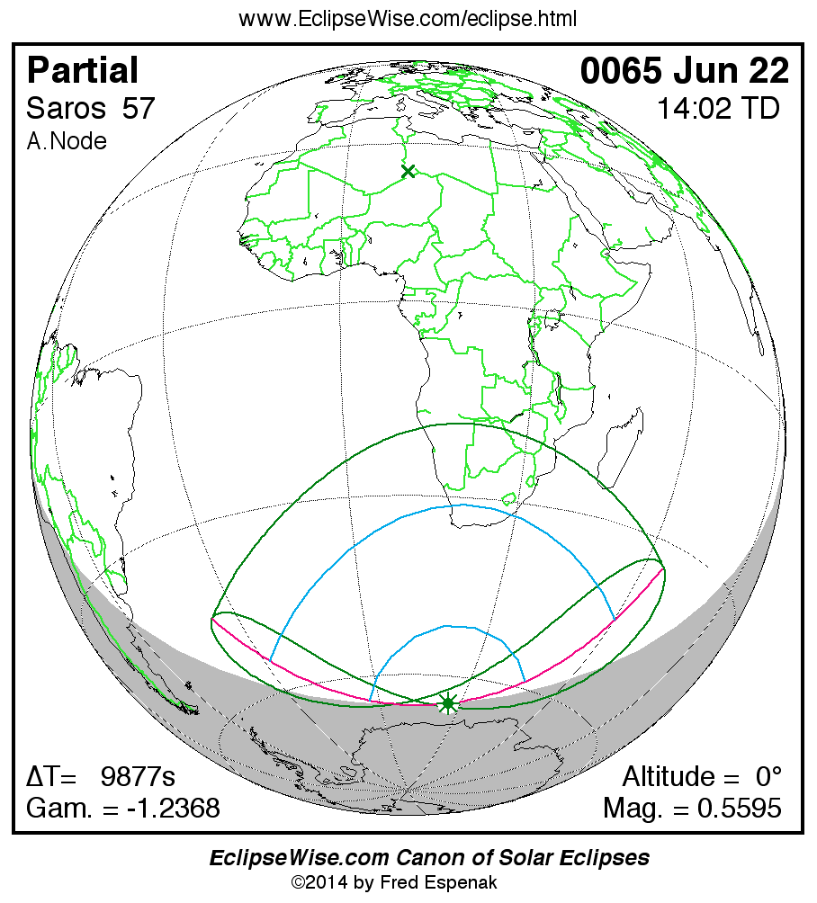 The instant of greatest eclipse takes place on 0065 Jun 22 at 14:01:56 TD (11:17:20 UT1).