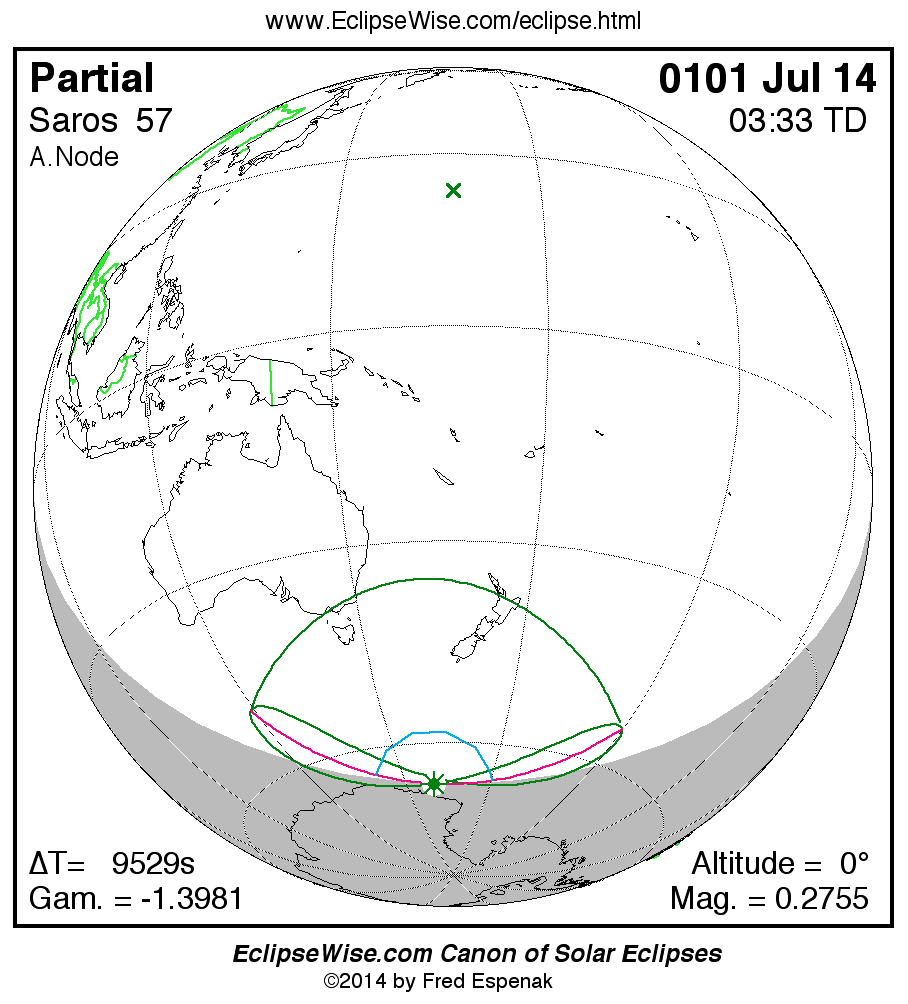 The instant of greatest eclipse takes place on 0101 Jul 14 at 03:32:44 TD (00:53:57 UT1).